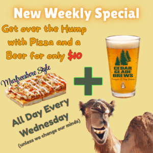 Hump Day Special! Get over the hump each week with a $10 Pizza and CGB Pint combo! Every Wednesday, all Wednesday. 15 Apr 2:00 pm - 9:00 pm